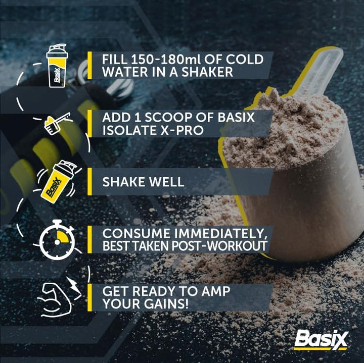 Add 5-6 oz. (150-180ml) of water, milk or your preferred beverage into a shaker bottle and add 30g (1 scoop) of Basix Isolate X-pro. Shake well until completely mixed and consume immediately.