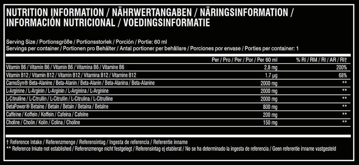- INTENSIVE FOCUS AND ENERGY For the ultimate workout session, this caffeine-rich pre-workout delivers energy and explosive concentration with 200mg caffeine, 2000mg L-citrulline, 2000mg CarnoSyn Beta Alanine and 800mg BetaPower Betaine.