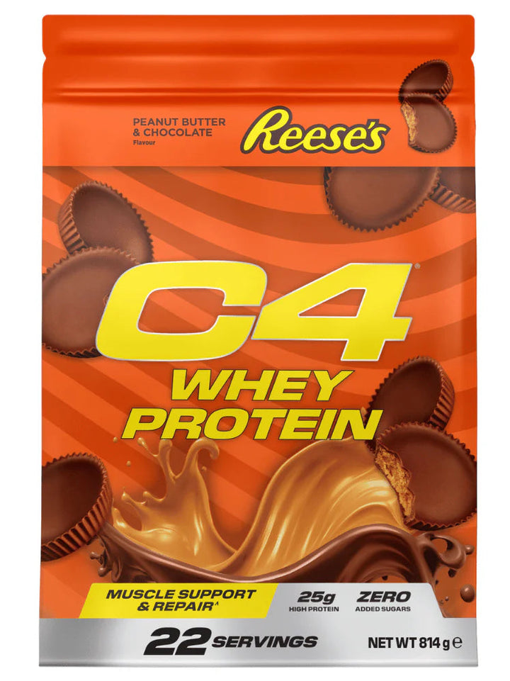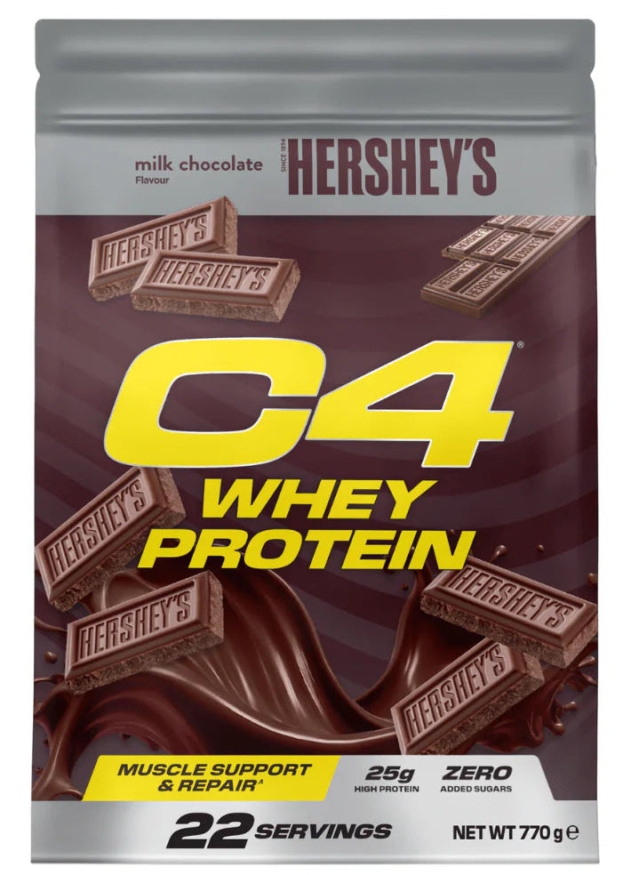 C4® Whey Protein is now available in three irresistible flavors: HERSHEY'S Milk Chocolate, REESE'S Peanut Butter & Chocolate, and Vanilla Bean. Each scoop packs 25g of protein to support muscle growth and recovery, all while being macro-friendly with zero added sugar.