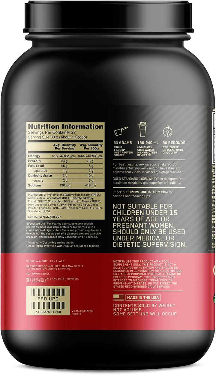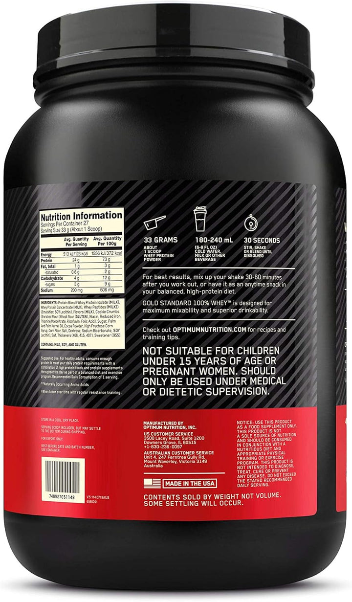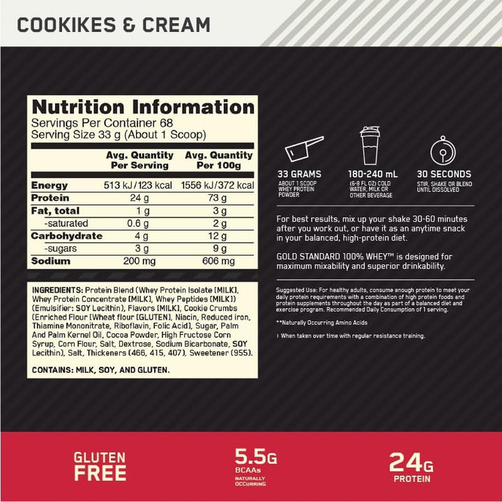 THINK OUTSIDE THE GLASS: Gold Standard 100% Whey™ can be used for more than just protein shakes. Try mixing a scoop into oatmeal, yogurt, or the milk that you pour over your morning breakfast cereal. Better yet, boost the protein content of muffins, cookies, brownies, etc. by adding a scoop or two to your baked goods recipes.