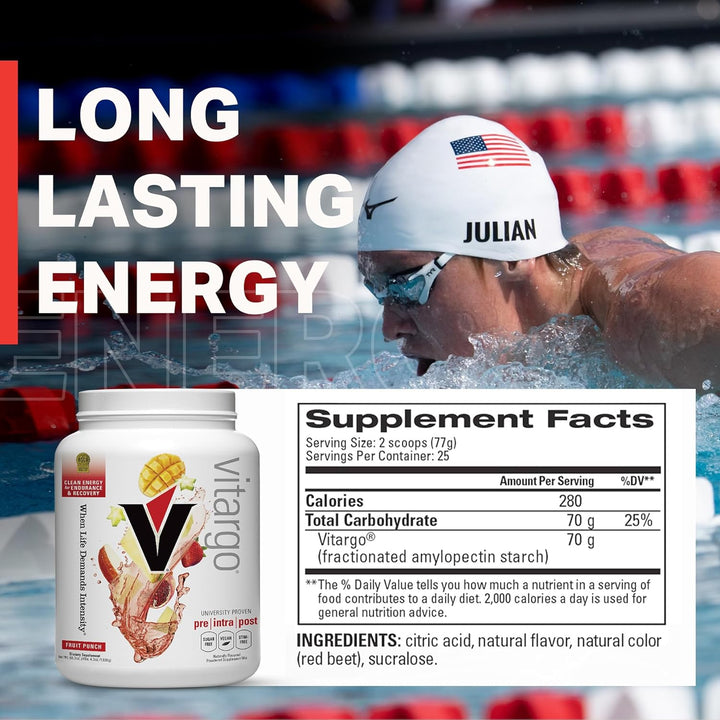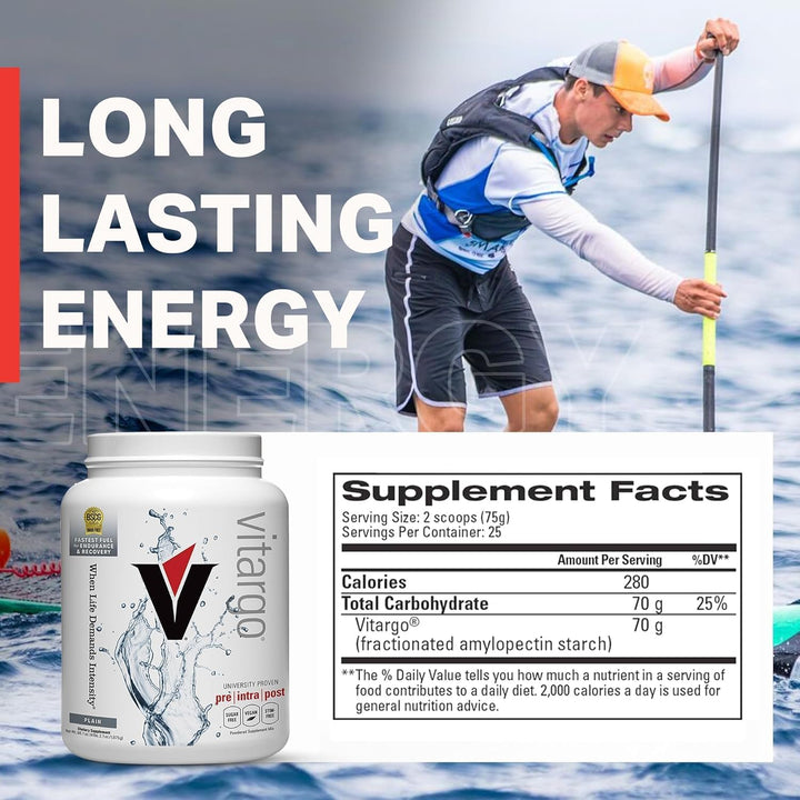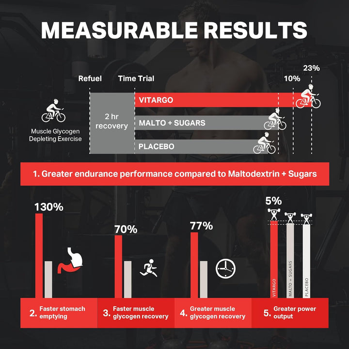 - BOOST PERFORMANCE Achieve up to 23% greater maximal endurance with vitargo carbohydrate powder (average of 10% greater) and 5% greater power output 2 hours after exhaustive, glycogen-depleting exercise, compared to maltodextrin + sugars. Trusted by elite athletes, this carb powder supplement fuels intense training sessions and accelerates recovery so you can push harder and perform longer.